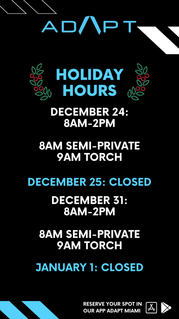 Don’t forget to mark down our ADAPT Holiday Hours so you don’t miss out on your workouts this holiday season!