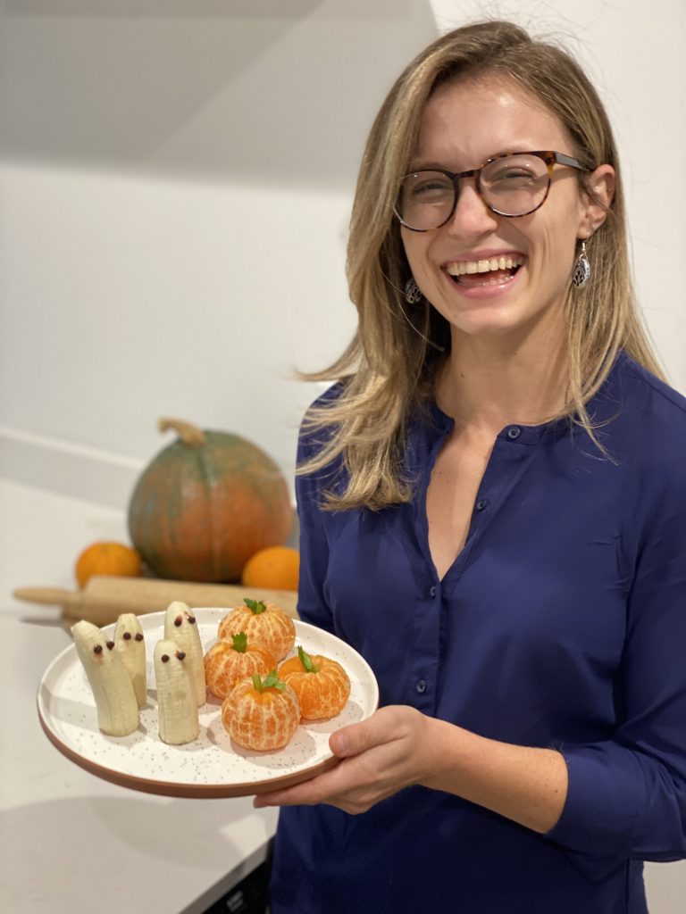 Ghost bananas with chocolate chip eyes and tangerine pumpkins with celery stems!